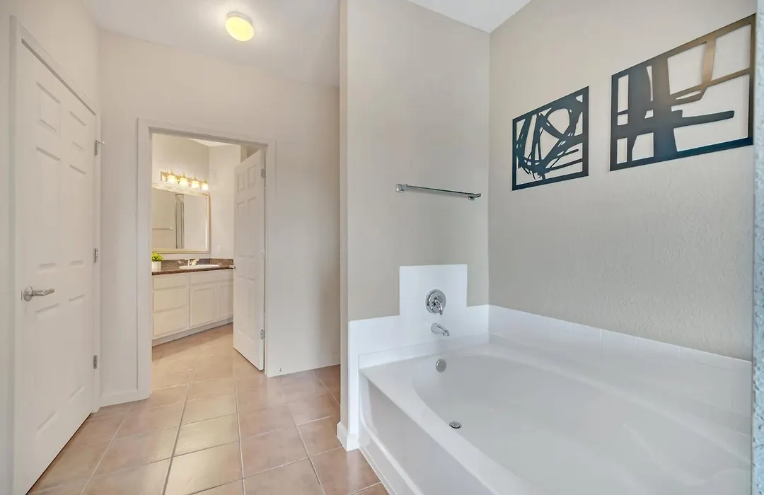 Bathroom facilities at 2Br Modern Pet-Friendly Condo 6 Mins From Disney villa also include a hot tub and a washing machine.
